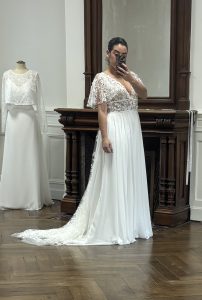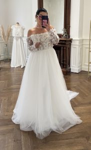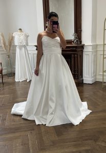 Nous fabriquons sur-mesure, sans aucune limite de taille, et tout est entièrement personnalisable. Par exemple, vous pouvez choisir le haut d’une robe et le bas d’une autre, ou bien ajouter des boutons, une fente, une traîne, et bien d’autres options pour créer la robe de vos rêves. En ce qui concerne les prix, ils varient entre 1100 € et 3000 €, selon les modèles et vos envies.