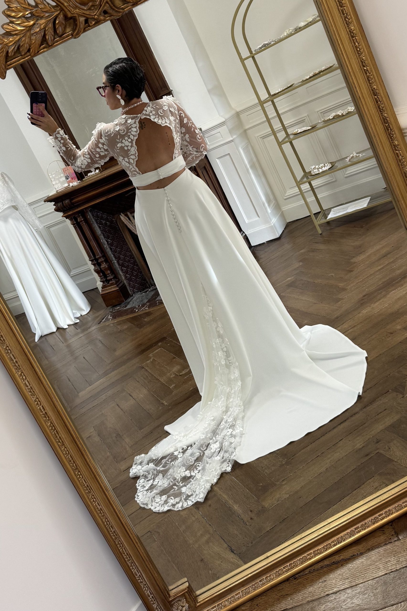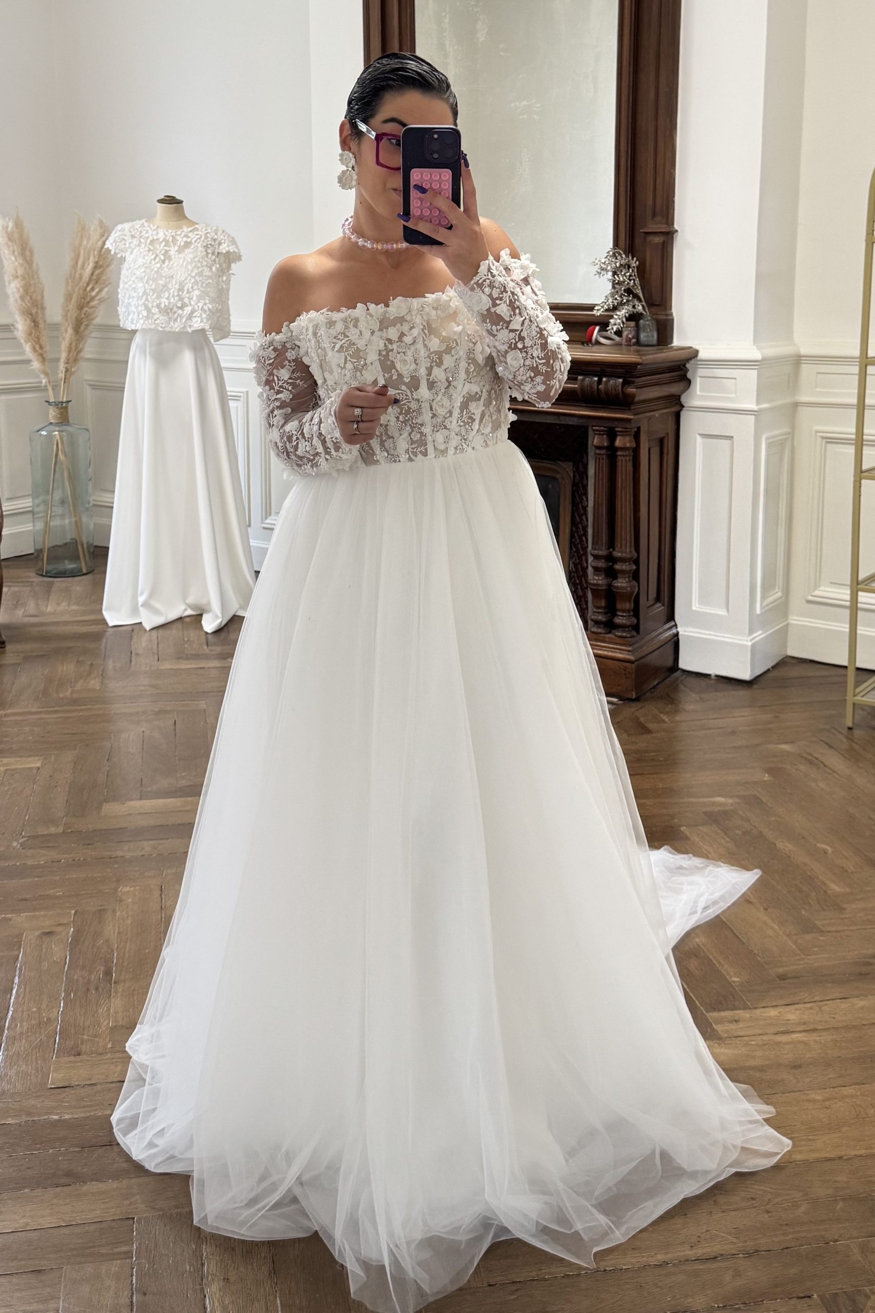 Votre robe est confectionnée sur mesure selon vos mensurations, garantissant ainsi une silhouette parfaitement mise en valeur. En outre, vous avez la possibilité de choisir la même robe que le modèle d’essayage. Cependant, vous pouvez également apporter les détails qui vous semblent importants et qui reflètent votre personnalité. Ainsi, chaque création devient unique et parfaitement adaptée à vos envies. De plus, si vous souhaitez retirer un élément de la robe, cela est tout à fait envisageable. Donc, nous vous offrons une totale liberté de personnalisation pour que votre robe de mariée soit à la hauteur de vos attentes.